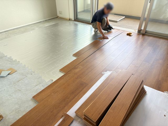 既存フローリングを撤去し、新しいフローリング材を敷き詰めていきます。