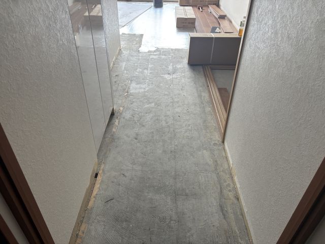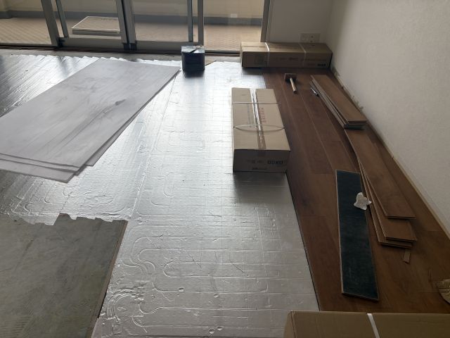 既存フローリングを撤去し、新しいフローリング材を敷き詰めていきます。